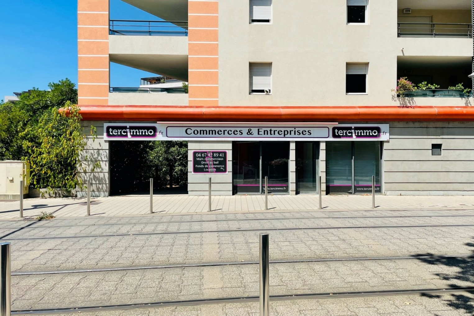 Montpellier Antigone, au pied du tramway (ligne 3, arrêt "Rives du Lez"). Belle visibilité. Très beau local commercial, en bon état. 99 m² intérieur, et jouissance exclusive d'une terrasse et d'un jardinet attenant.